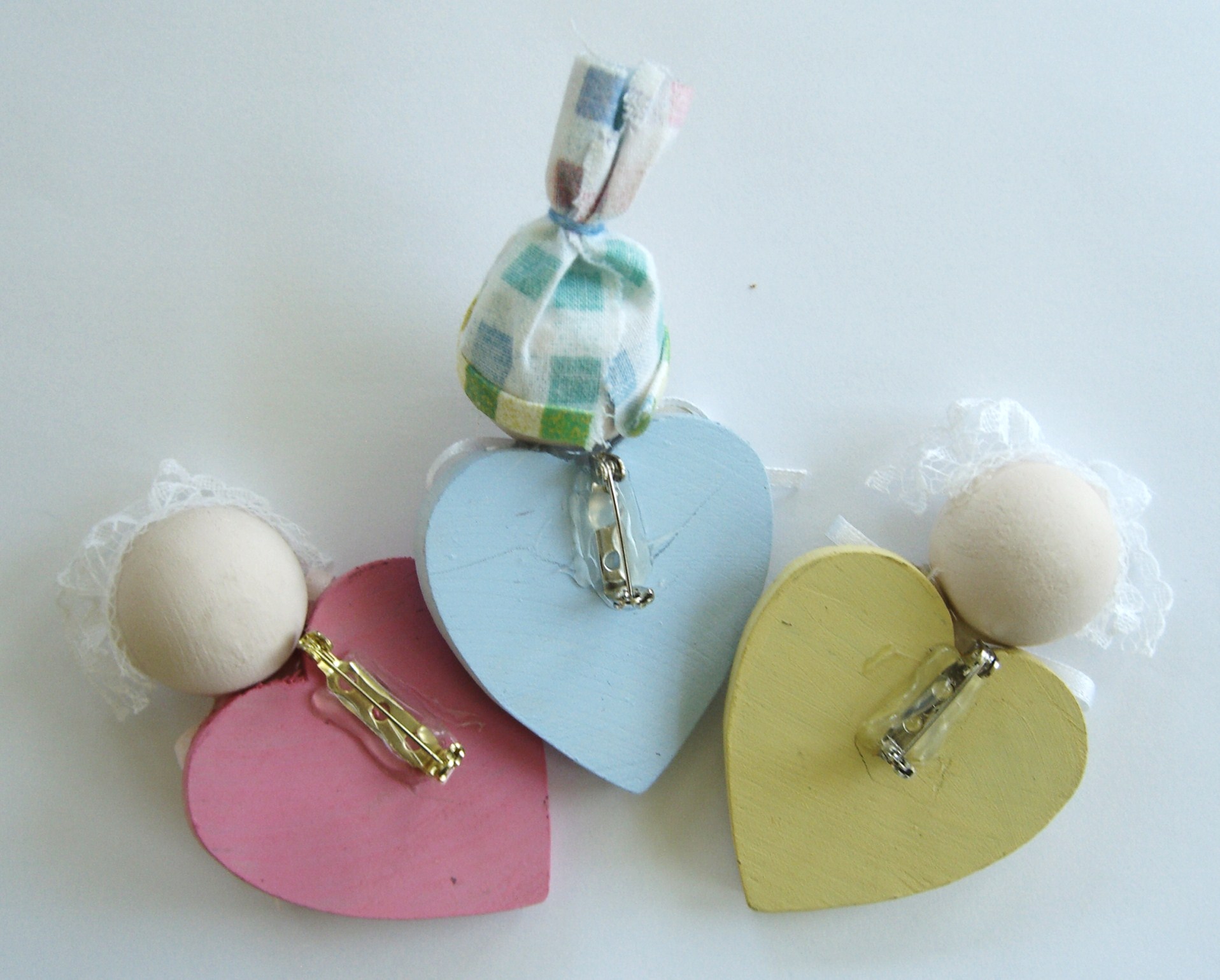 Paint heart and head, let dry. Hot glue head onto heart. Then hot glue ribbon bonnet or cap (I tied top of cap with a little piece of embroidery floss). Glue on ribbon bow,  earring for mouth and pin on back, just below head. Then with the sharpie, draw on eyelids.