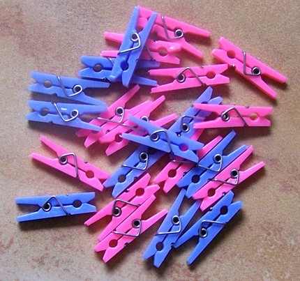 Pick up a set of clothes pins, we found a cute set of mini plastic pink and blue pins. Get enough for one per guest.