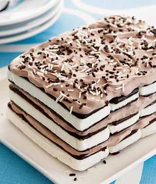 I generally make my ice cream cake with one layer of sandwiches in a 9X13 dish, topped with whipped cream.