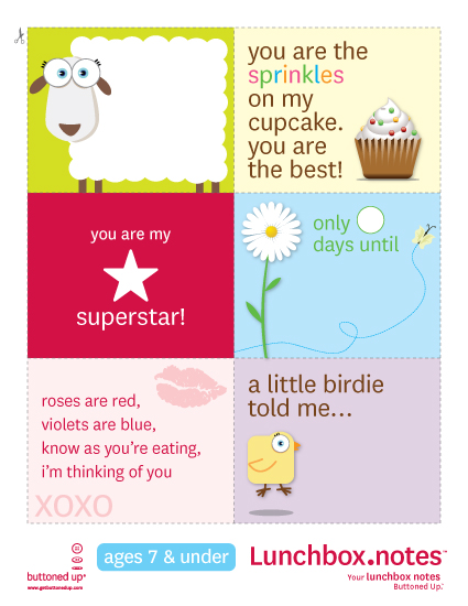 Send Some Lunchtime Love Print, cut, and send with your kid’s lunch. VIA Share this: Share on Facebook (Opens in new window) Facebook Share on X (Opens in new window) X Print (Opens in new window) Print Share on Tumblr (Opens in new window) Tumblr Email a link to a friend (Opens in new window) Email Like Loading... Related KidsKitchenLove