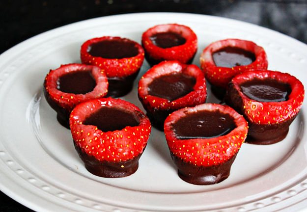 They’re as simple as they look — hulled out strawberries dipped in melted chocolate and filled with whatever you’d like. We combined vanilla vodka, Godiva liquor, and some chocolate syrup for a delicious shot in an edible glass. Take your shot and eat it too!”