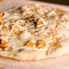- In a medium bowl combine the cubed chicken, melted butter and hot sauce. Mix well. Spread whole bottle of salad dressing over crust, then top with chicken mixture and sprinkle with shredded cheese.