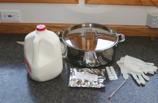 –1 gallon milk — not ultra-pasteurized. If using raw milk, and you aren’t absolutely, positively sure it is free of pathogens, heat the milk to 145 degrees Farenheit and keep it there for 30 minutes to pasteurize it. If using store-bought milk, be sure you go with regular “pasteurized” milk, and not “ultra-pasteurized” (it’ll say on the label) as the latter has been heated to a very high temperature that destroys all the organisms you need to make cheese.