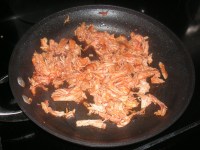 3. Using two forks shred the chicken. Put it back into the skillet along with the garlic, Red Hot, and celery.