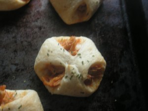 4. Meanwhile, unroll the crescent rolls on a cookie sheet. Divide into 8 triangles. Cut each triangle in half from the point to the middle of the longest side, making 16 triangles. Place 1 T. of chicken mixture on the center of each triangle. Bring the three corners to the center over the chicken filling and pinch together. Brush each chicken bite with the remaining 1 teaspoon of oil. Sprinkle with parsley.