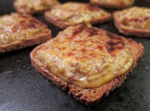 Brown sausage and drain. Add rest of ingredients; stir until cheese is melted. Spread on rye bread. NOTE: Can be frozen at this point. Bake at 400 degrees 10 to 12 minutes. via