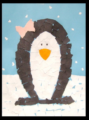 Tear paper to small (about 1/2 inch) bits. Start by gluing black bits into horseshoe shape. Add black for feet and bottom of tummy. Then fill in with white, as in picture. Don’t forget to add snow falling from the sky using smaller bits. Add orange beak. Draw in eyes.