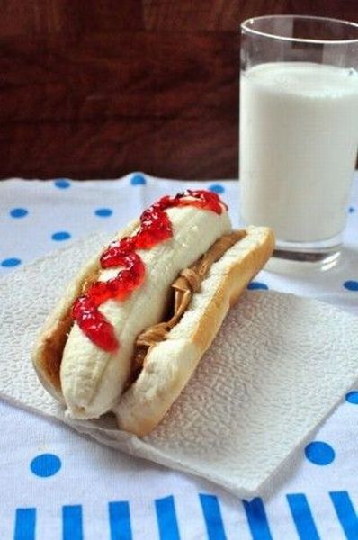 PB and Banana Dog Spread peanut butter on a hot dog bun. Lay banana on top. Top with squeezable jelly. Serve with milk! Great after-school snack. via Share this: Click to share on Facebook (Opens in new window) Facebook Click to share on X (Opens in new window) X Click to print (Opens in new window) Print Click to share on Tumblr (Opens in new window) Tumblr Click to email a link to a friend (Opens in new window) Email Like Loading... Related KidsKitchenPranks