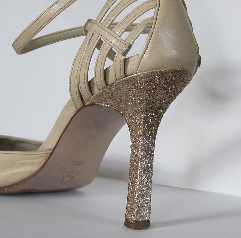 Tape off the upper part of the shoe with painters tape. Whip up a mixture of fine glitter and mod podge. Brush onto damaged heels. Let dry. Awesomeness from Wobisobi !
