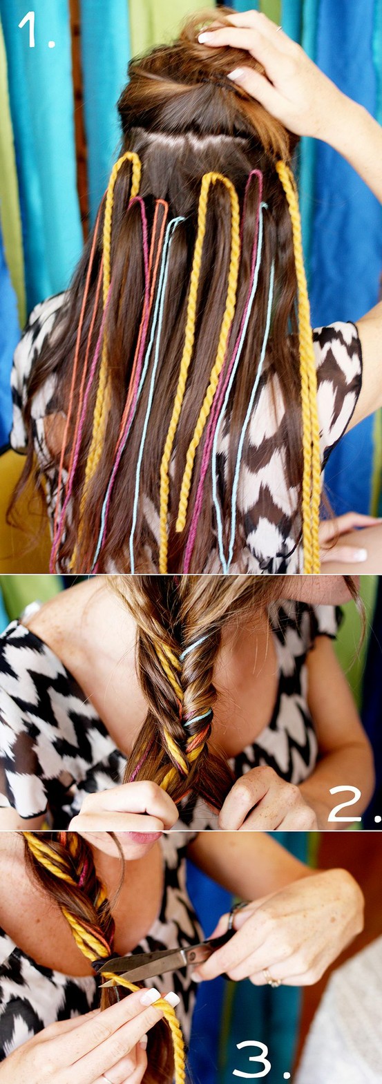 Lift up and secure top section of hair. Tye random cords and strings into hair as in picture. Release top hair. Braid all, any kind of braid, like the fishtail shown here. Tie off braid. Cut off too long cords. (Be careful not to cut the hair!) Cute and stylish idea via.