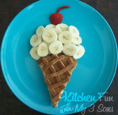 We used 2 pieces of wheat bread, cheese, butter, 1 banana, and 1 strawberry. We cut the corners off of the bread to shape it like a cone. Save the scraps. We buttered our bread and placed our cheese in between to fit on the bread. Grill it up and place on the plate. Take the crust off of the scraps and pinch off pieces of it to cross on top of the bread. You can skip this, but we thought it looked more like a cone that way. Take 1 banana and slice it. Pile the slices on the top edge of the bread to look like ice cream. Take a strawberry and cut it to look like a cherry.