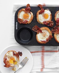2. In a large skillet, cook bacon over medium, until almost crisp, 4 minutes, flipping once. (It will continue to cook in the oven.) Lay 1 bacon slice in each bread cup and crack an egg over each. Season with salt and pepper. Bake until egg whites are just set, 20 to 25 minutes. Run a small knife around cups to loosen toasts. Serve immediately.   via marthastewart