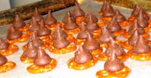 First we covered a cookie sheet with waxed paper. Then we covered the cookie sheet with a single layer of pretzels and put a Hershey’s kiss on each and every pretzel. Then we put them in the oven at 200 degrees until they were all warm and melty and oh so delish.