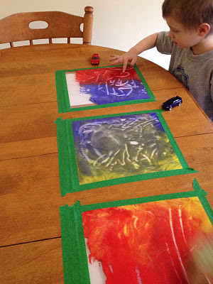 From Hippiehousewife: Pour some tempora paint into a zipper lock bag. Get all the air out before you securely close the bag. Use painters tape to tape to laminate table. (If you have a dark colored table, put a light piece of paper between bag and table first.) Let your kids at it. Fun to mix colors too!