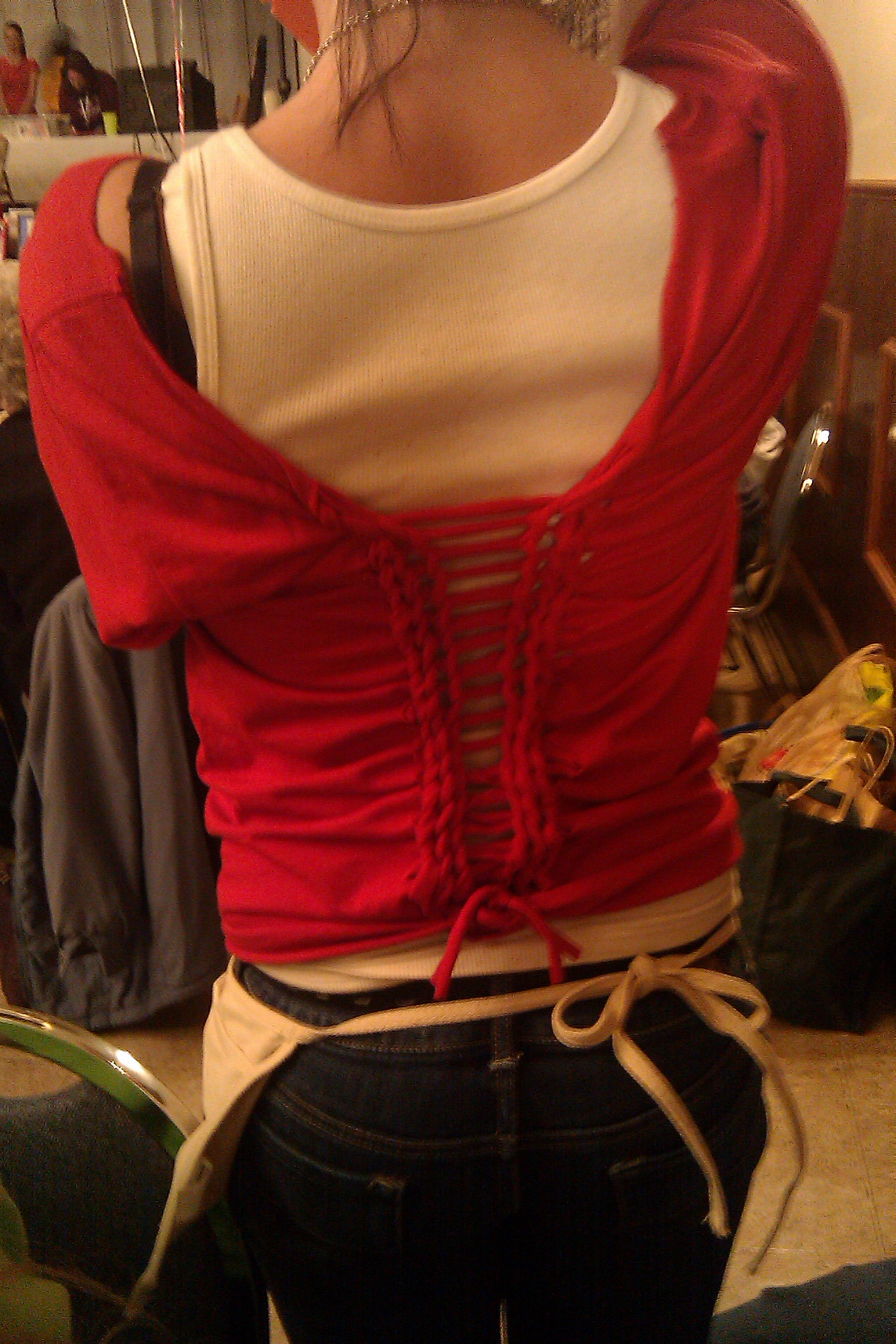 Here’s our waitress’s top at a local trivia event. All the girls had thier shirts woven like this – it was cute!