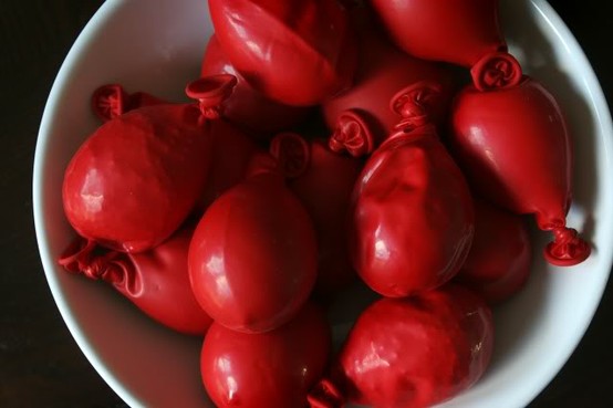 Fill ballons with items. Tie securely. Be sure to make pairs.