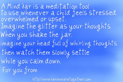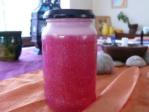 We mixed 1 tablespoon of pink glitter-glue with about 1 cup of hot water, then added pink food colouring and a tiny tub of glitter. The glue makes the water so thick and gooey that the glitter just slowly and gently swirls around, it takes about 5 minutes for all the glitter to settle, perfect to gather your thoughts!