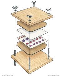 A plywood press uses the same structure of layering lining papers and cardboard, but adds an outer plywood shell. The top and bottom squares of plywood need holes drilled into all four corners to place bolts or screws. Wing nuts hold the bolts in place. The finished press looks like a miniature table, with a plywood top and bottom and bolts as legs.This plywood press requires more effort than the cardboard press, but its construction produces more even weight distribution and a sturdier press.