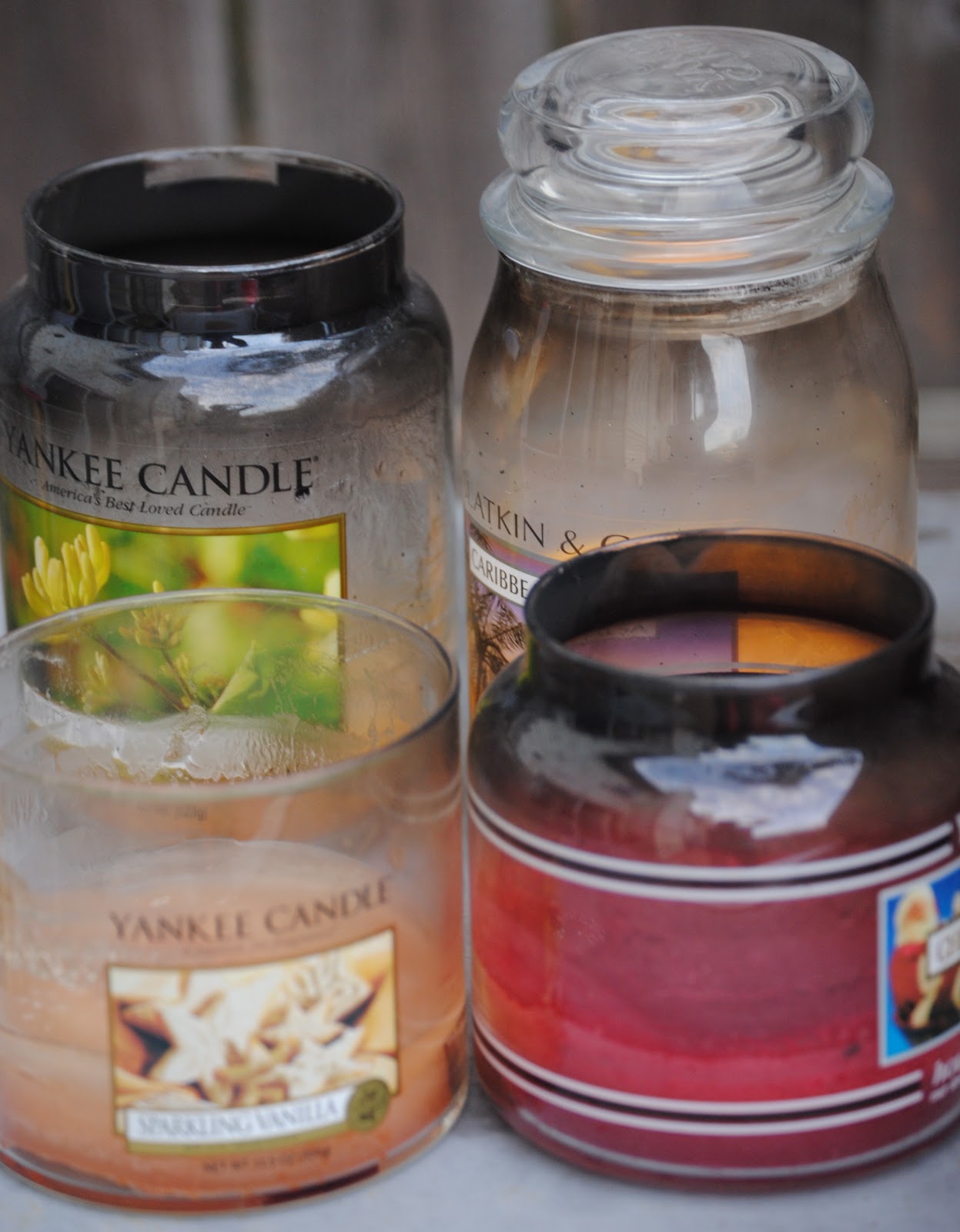 So in an effort to declutter and get a little things organized before we decorate for the holidays I decided to take these ugly things and make brand new layered candles.