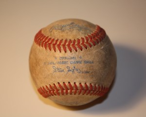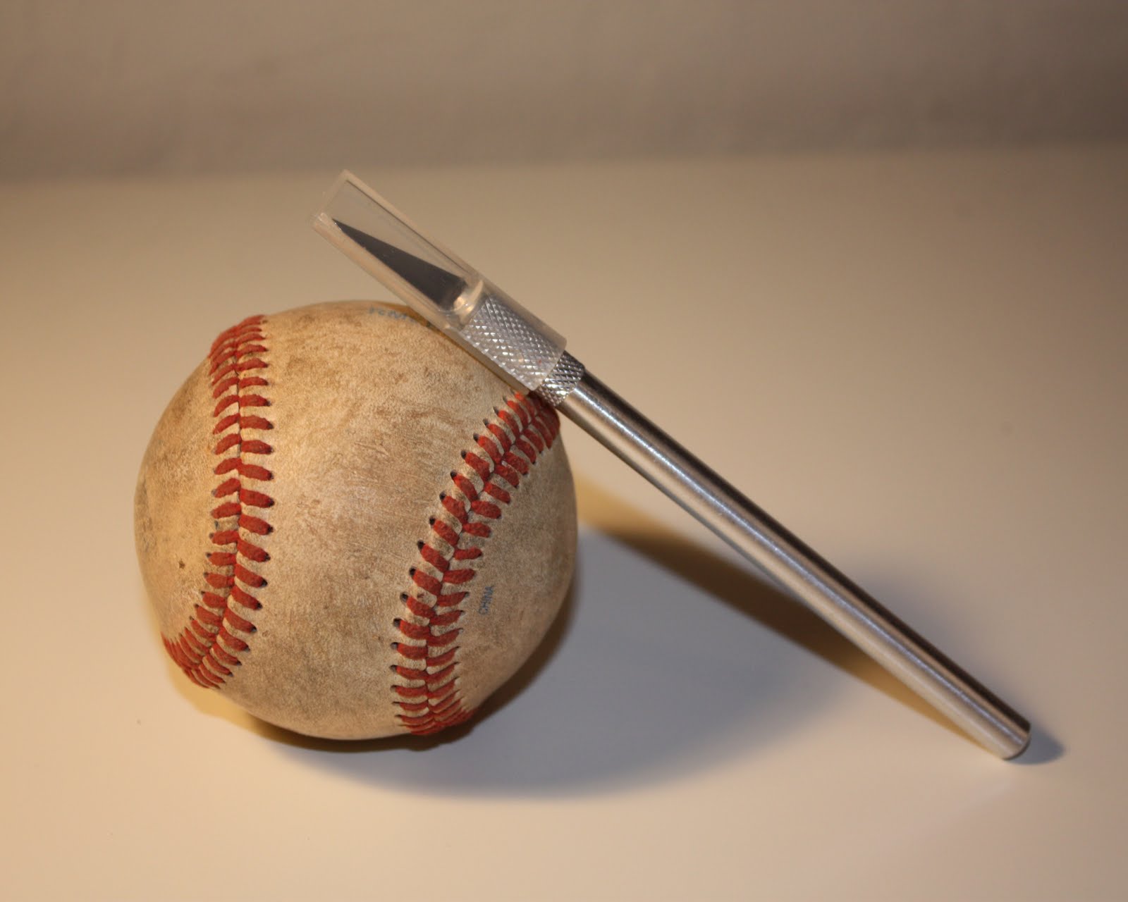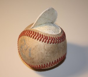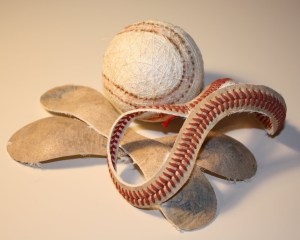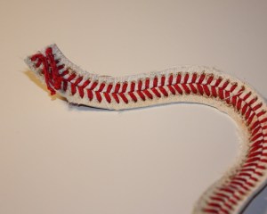 First you will need to cut out the stitches all the way around the baseball. It’s hard to see in the picture below, but there is a tiny line tracing the stitches from where I cut the leather. Try to get your cuts as close to the stitches as possible without cutting them. But don’t worry, you can always trim off any uneven parts when you’re all done. You will have to apply a fair amount of pressure, and maybe even got over each line twice to cut all the way through the leather.