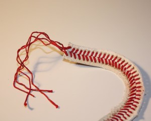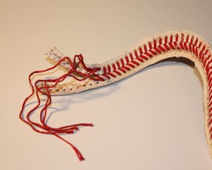 You won’t need the ball or leather any more for this project. Locate the point on the seam where the stitching begins/ends, this is where you should cut the remaining leather. Be careful not to cut off the excess string, you’ll need every inch! What you should have now is one long seam with two ends that look like this: