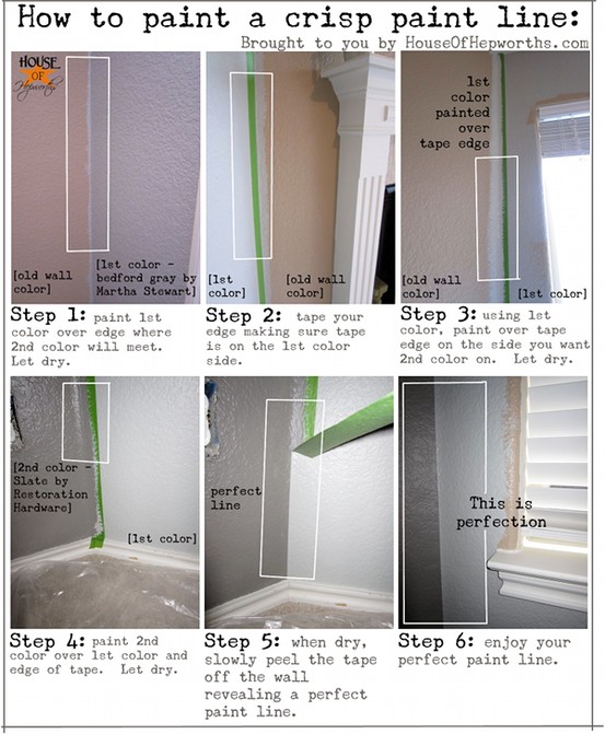 Paint wall color #1 over lapping a little onto the #2 color. Let dry. Tape where you want #2 to start. HERE’S the trick: paint #1 over tape as in pic. Let dry. THEN paint #2 where you want it.