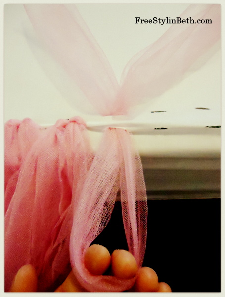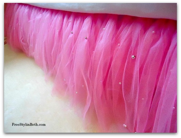 Click HERE for complete instructions. The designer used 20 yeards of inexpensive tulle cut into strips and then used a simple larks head knot to attach the pieces onto a plain bed sheet. After adding some beads – the result is adorable!