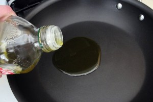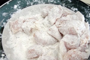 Pour a small amount of olive oil in a skillet and brown the flour-covered chicken.