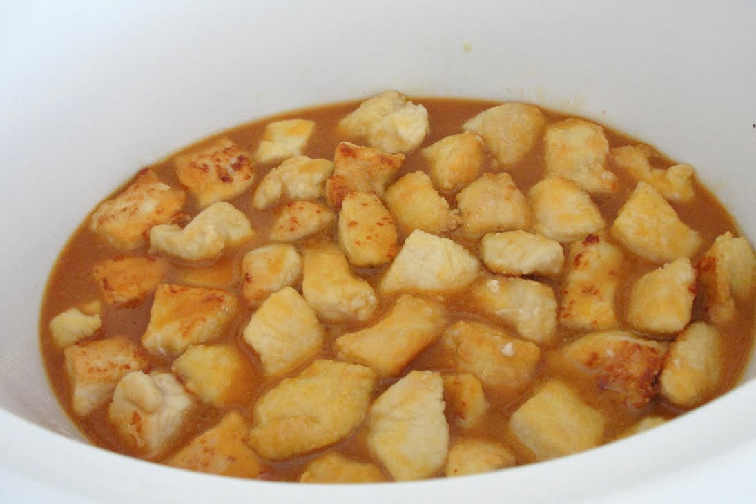 After the chicken is done cooking, pour the pieces into the crock pot.