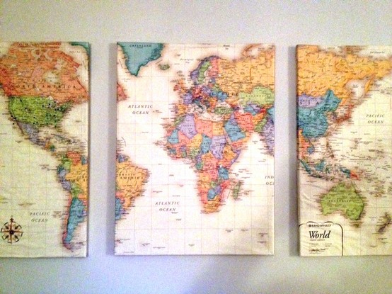 Place a world map (or a region if your a limited traveler) over 3 canvas, cut into 3 pieces. Coat each canvas with Mod Podge and wrap the maps around them like presents. Let dry and hang on the wall about 2″ away from each other. Then add pins to all the places you’ve been. via