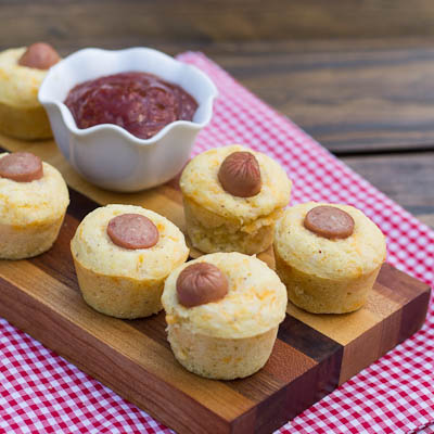 - Fill each muffin tin nearly to the top with batter. Stick at hot dog piece into the center of each muffin. The batter is pretty thick and will do a god job of holding the weiners upright.