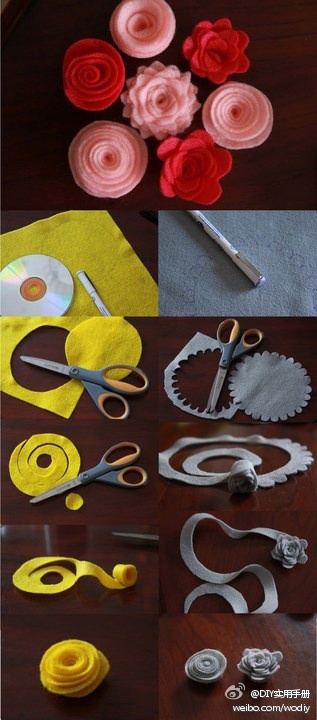 Cut out a circle of felt. Cut into spiral shape. start rolling from outside of circle inward. Use glue to secure. For a fancier flower; cut a design around circle as in right of photo. So easy!