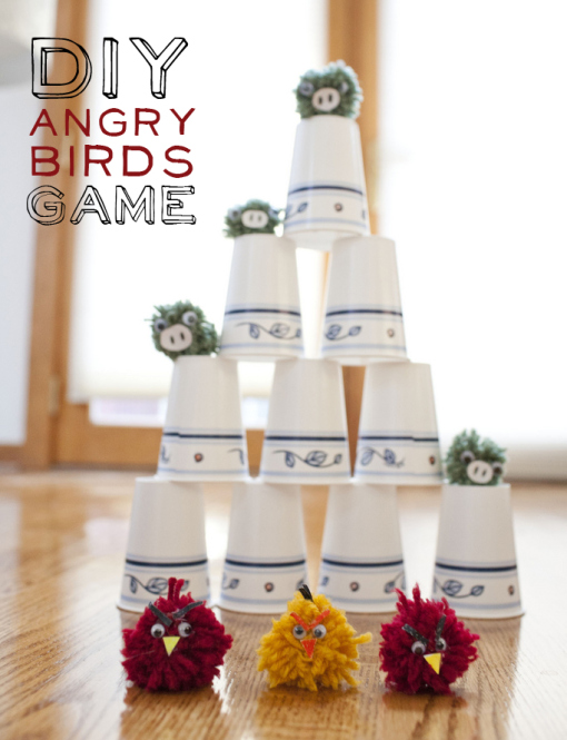 Use yarn and misc craft supplies to make the birds and pigs. Use dixie cups for the structures to knock down. Game: toss the birds and try to knock down the pigs. When all the pigs hit the floor you win! Great for a rainy day activity. idea via