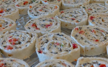 Roll up tortillas; wrap in plastic wrap and refrigerate overnight. Slice into 1/4-inch slices before serving. via