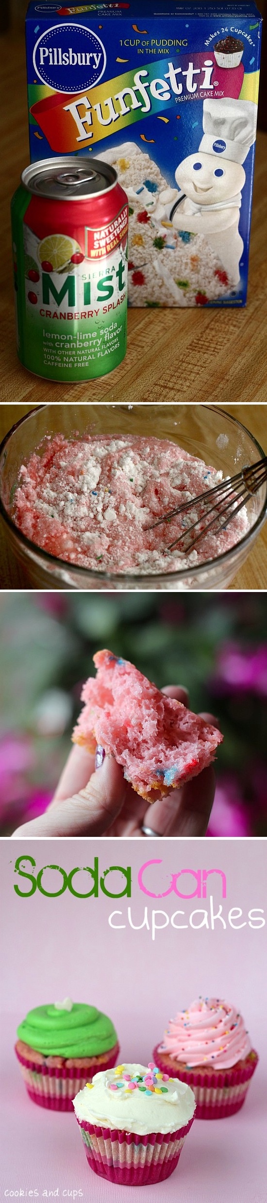 So simple: Mix your standard cake mix and a can of soda. Feel free to mix and match. Line cupcakes and fill 2/3 full with batter. Bake til toothpick comes out clean.via
