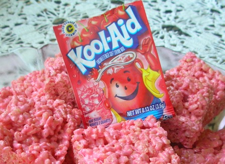 Add a packet of unsweetened Kool-Aid drink mix to the melted marshmallows before stirring in the puffed rice. Another idea, make two batches with two different flavors. When you press the mixture into the pan, marble the two flavors. Cool!! via