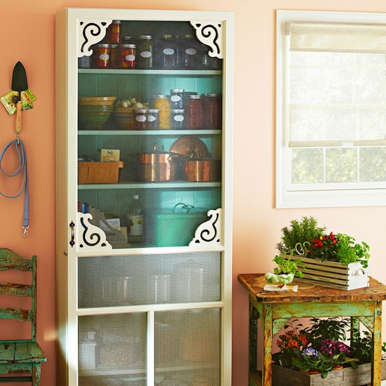 Country, cute and functional. Add a screen door to a free standing bookshelf for pantry items, craft items, books or whatever – whimsical! Find out how to HERE