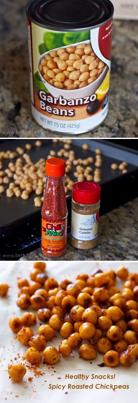 Reblogged from Betsylife: Preheat oven to 425 degrees. Toss chickpeas with oil and seasoning until evenly coated. Spread on a rimmed baking sheet covered in parchment paper. Roast, stirring occasionally, until chickpeas are golden and crunchy, about 25 minutes. Let cool completely. Store in an airtight container for up to 2 weeks.