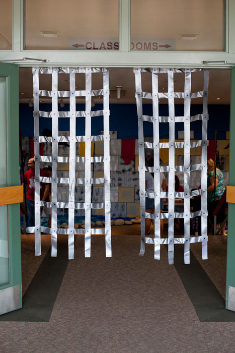 Lay out a long strip of duct tape- sticky side up. Carefully place another piece (sticky sides together) over. Make several of these. Then lay them out, and connect with horizontal pieces. Use permanent marker to add ‘bolts’ and or other ‘hardware’