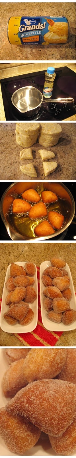Too Easy Doughnuts Cut biscuits into quarters Drop in 200 – 240° oil for a couple of minutes (flip halfway) Cool sightly on paper towel Roll in sugar or brown sugar or powdered sugar via Share this: Click to share on Facebook (Opens in new window) Facebook Click to share on X (Opens in new window) X Click to print (Opens in new window) Print Click to share on Tumblr (Opens in new window) Tumblr Click to email a link to a friend (Opens in new window) Email Like Loading... Related Breakfast - Eat it!Dessert - Yum!Kitchen