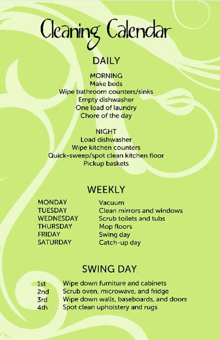 Here’s a basic chart – of course you’ll have to edit as you need (ie: take out trash, etc.)… But its a good start! via