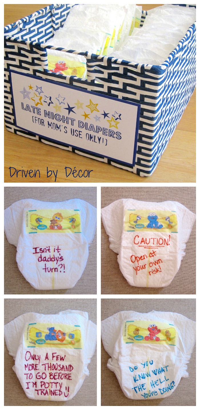 At the party. the shower guests are each given a few diapers and some Sharpies and are asked to write a message to the new mom on the front and/or back of the diapers. These diapers are to be reserved for late night changings by mom (or dad – lets be fair!) so the point is to write something funny or encouraging to give her a little pick-me-up in the wee hours of the night!