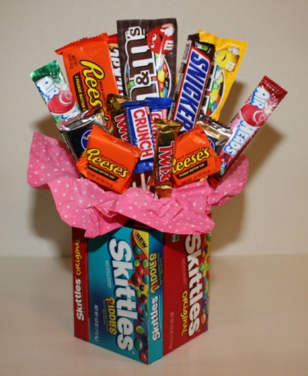 Candy Bouquet Supplies: 4 “movie boxes” of candy (all the same size) full size candies miniature candies wooden dowels floral foam block hot glue gun tissue paper Then Click HERE for the instructions Share this: Click to share on Facebook (Opens in new window) Facebook Click to share on X (Opens in new window) X Click to print (Opens in new window) Print Click to share on Tumblr (Opens in new window) Tumblr Click to email a link to a friend (Opens in new window) Email Like Loading... Related CraftsDessert - Yum!Gift itParty Ideas