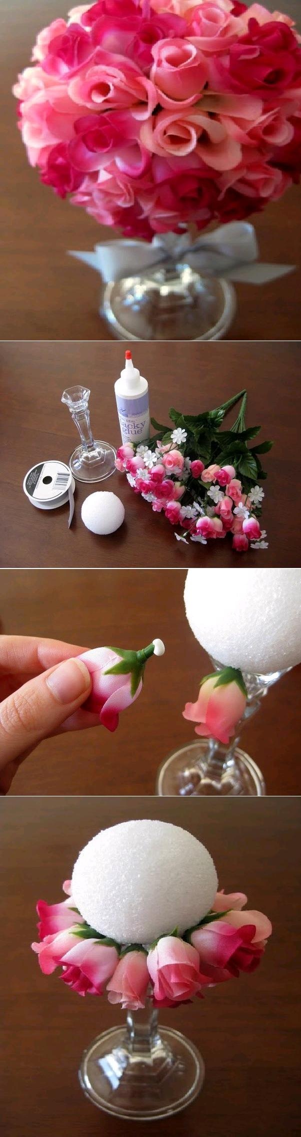 Glue the ball into the candle stick – hot glue might hold it more securly, but be advised that hot glue will melt styrofoam, so use sparingly. Remove the flower buds from their stems. Put a dab of glue onto the back of bud and press into ball as in photo. Tip: add a ribbon. You could also add some of the green leaves here and there. Lovely and inexpensive!