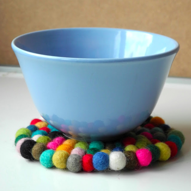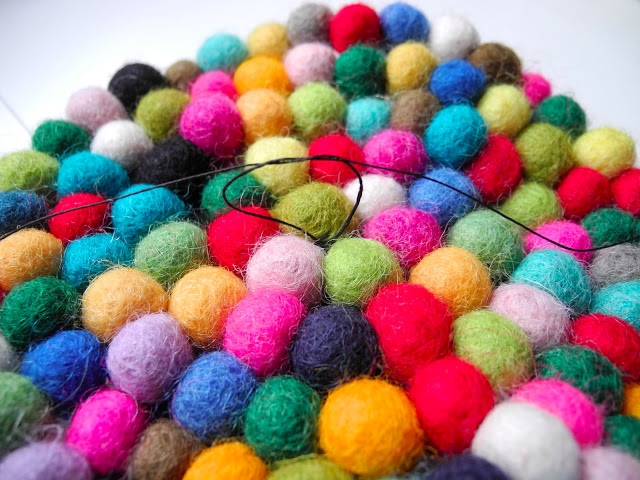 basically it says to use strong yarn, then make a “snake”from all the little felt balls, roll it up into a coaster, then stitch star-wise though the coaster to keep it all together.