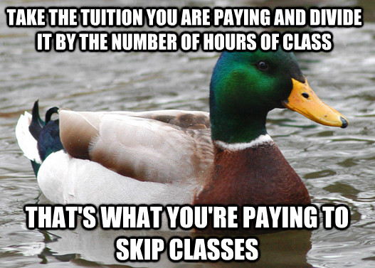 Thinking About Skipping a College Class? First do this: Then, get your rear in gear and off to class! Also applies to those times you’re thinking about blowing off work. Don’t do it!! Share this: Share on Facebook (Opens in new window) Facebook Share on X (Opens in new window) X Print (Opens in new window) Print Share on Tumblr (Opens in new window) Tumblr Email a link to a friend (Opens in new window) Email Like Loading... Related $ave itBuy itDid You Know?EducationKidsWork