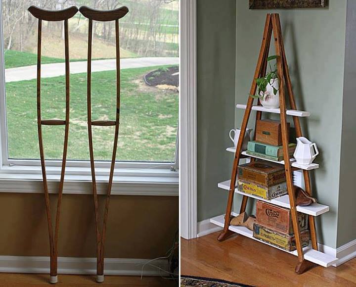 Crutches Turned Bookshelf Genius! Remove the bottoms, flip over and attach together the top. Add shelving. Check out the how to HERE Share this: Click to share on Facebook (Opens in new window) Facebook Click to share on X (Opens in new window) X Click to print (Opens in new window) Print Click to share on Tumblr (Opens in new window) Tumblr Click to email a link to a friend (Opens in new window) Email Like Loading... Related $ave itAround the houseRecycle itWorkshop