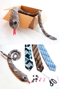 First sew the eyes onto the fat end of the tie (being sure to leave an opening for the filling). Fill the tie – not too full or it will only lay straight! Think about adding some bells or other rattling objects first into the skinny end to make a rattle snake! Pin or hold the tongue in place and sew closed the opening. This is an easy craft for beginning sewers.