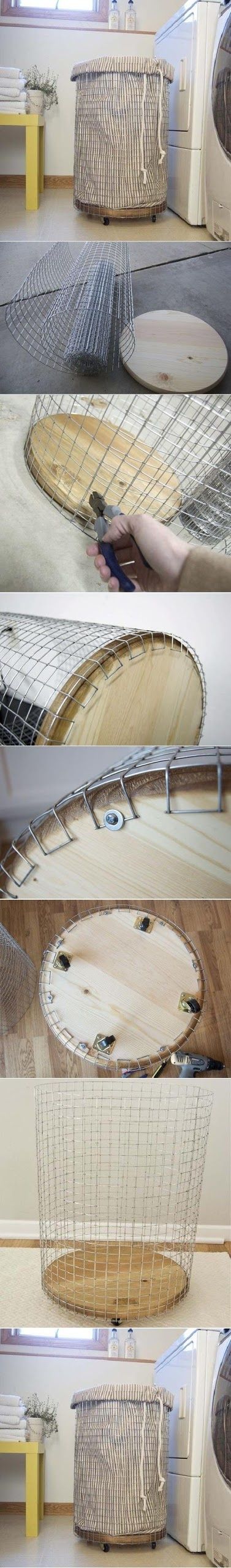 Cut a circle of thick/strong fabric same size as wood circle. Cut another the same size and length of wire sides – but taller enough to fold over for the rope drawstring. Sew pieces together and fish the rope through. voila!