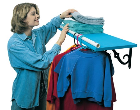 Laundry shelf does double duty Sometimes you just need another place to hang clothes, like on the shelf over your washer and dryer. Turn the edge of that shelf into a hanger rack by pre-drilling some 3/4-in. plastic pipe and screwing it to the edge of the shelf. Check it out HERE